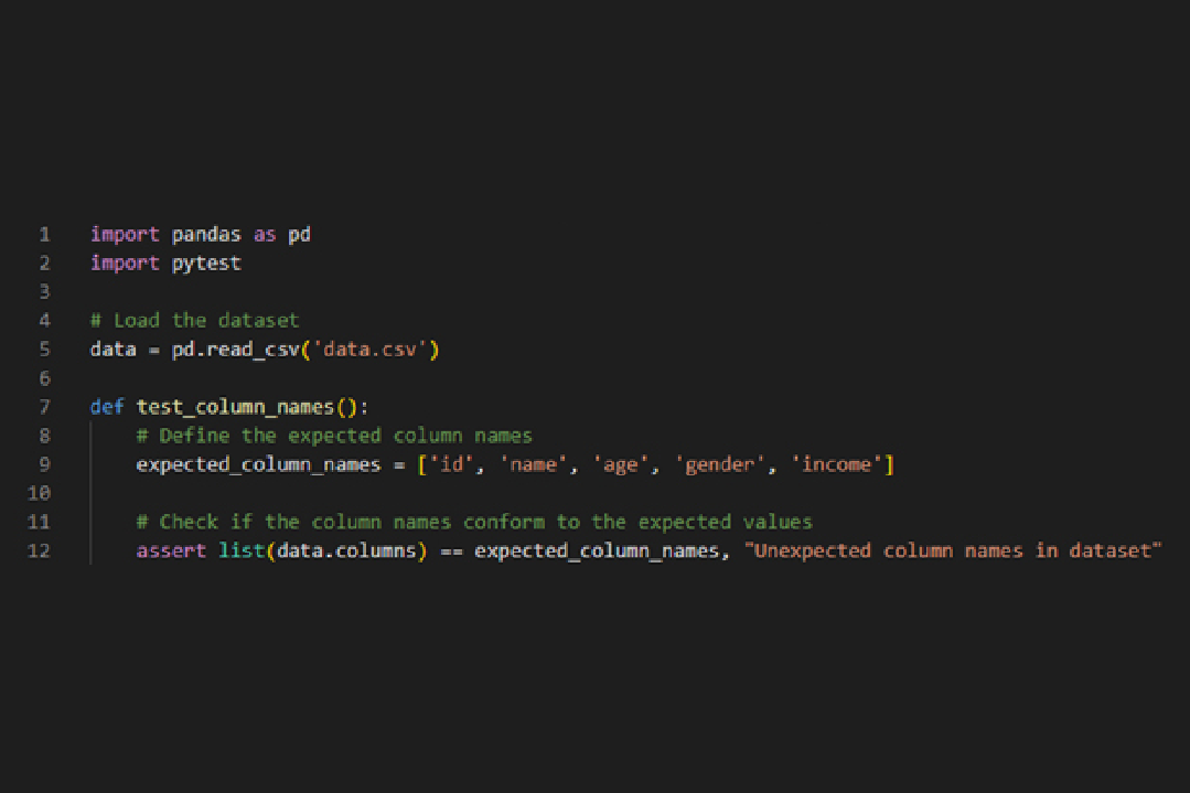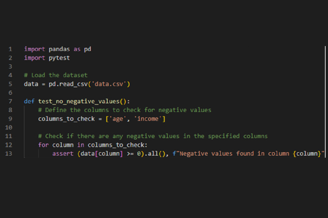 Stel vragen over de data, waarom komen we in kolom ‘income’ alleen maar positieve bedragen tegen, is dat altijd zo? Uit zulke vragen komt bijvoorbeeld naar voren dat ‘income’ altijd een positief bedrag moet zijn, dat verwerk je dan in een test zoals in het voorbeeld hieronder. De domeinkennis van collega’s uit de business kant is essentieel om effectief de kwaliteit van de data te kunnen testen, zoek dus actief de business op bij het maken van deze testen. In een ideale wereld ontstaat er een samenspel tussen de techniek en business waarbij deze elkaar actief vinden om de datakwaliteit te verbeteren. Zoek met het maken van testen in deze fase naar antwoorden op de volgende vragen: