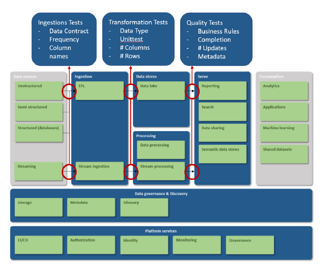 Een Data Pipeline is onder te verdelen in verschillende onderdelen. De data stromen van het ene blok naar het volgende blok. Bij elke transitie kunnen tests gedaan worden. Hieronder staat een referentiearchitectuur van een Modern Data Platform. Op het moment dat de data voor het eerst binnen komen, onderwerpen we deze direct aan een aantal testen. Dat noemen we de Ingestion Tests. Om verder gebruik te maken van de data, worden deze getransformeerd. In deze fase testen we met Transformation Tests. De laatste testfase is tijdens het schoonmaken van de data en noemen wel Quality Tests. We leggen deze begrippen verder uit.