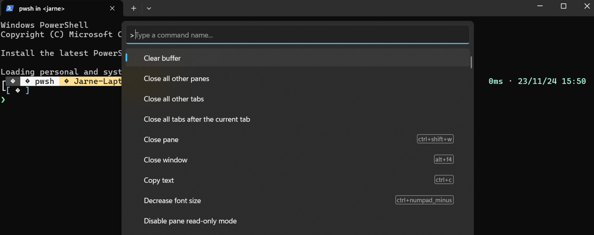 Net als moderne IDE’s biedt Windows Terminal een opdrachtpalet (Ctrl+Shift+P). Hiermee is directe toegang tot alle functionaliteiten mogelijk zonder sneltoetsen te hoeven onthoude, van het openen van nieuwe tabbladen tot het uitvoeren van aangepaste opdrachten.