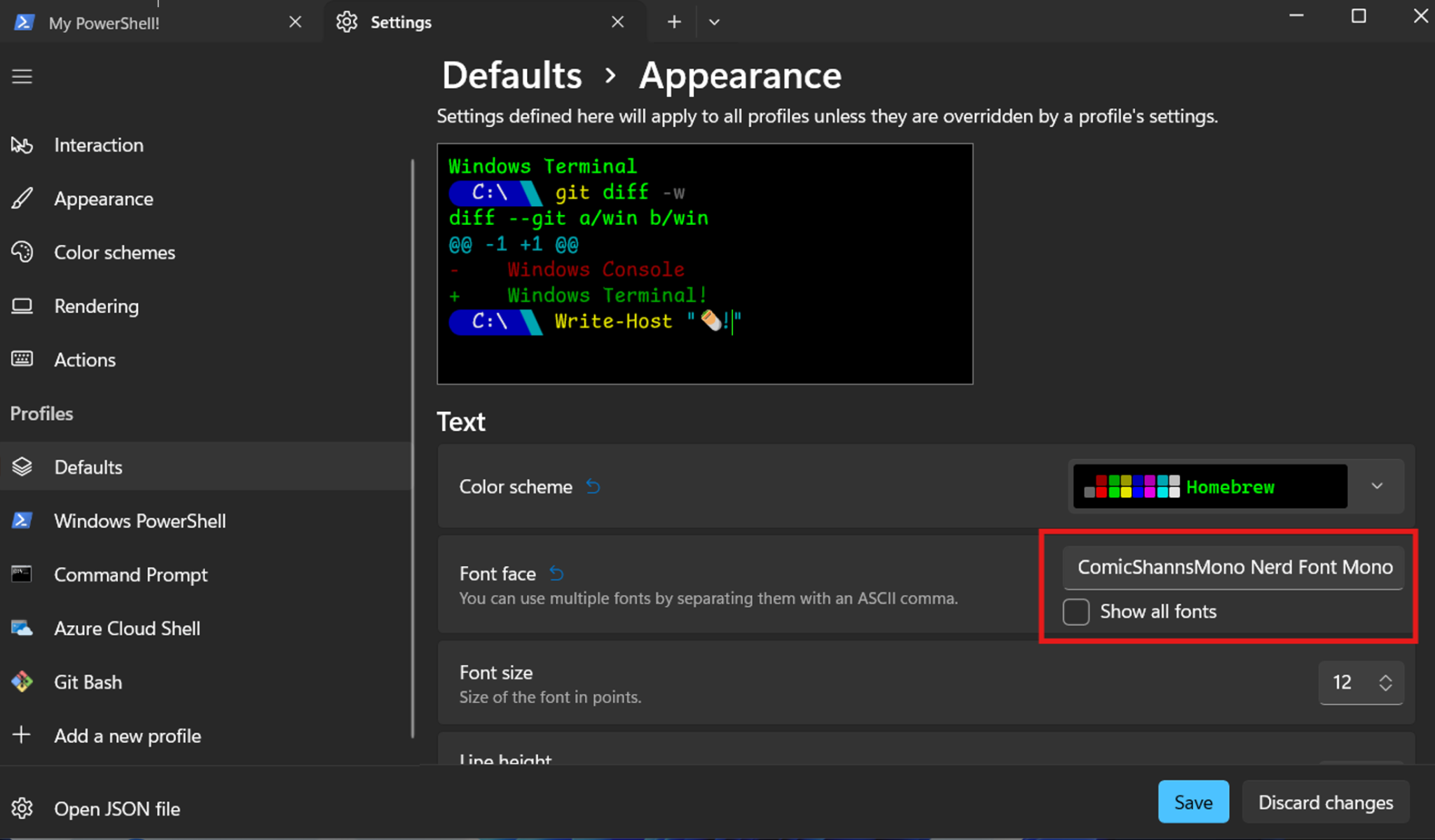 Deze aanpassingen worden toegepast op elke command shell binnen Windows Terminal.