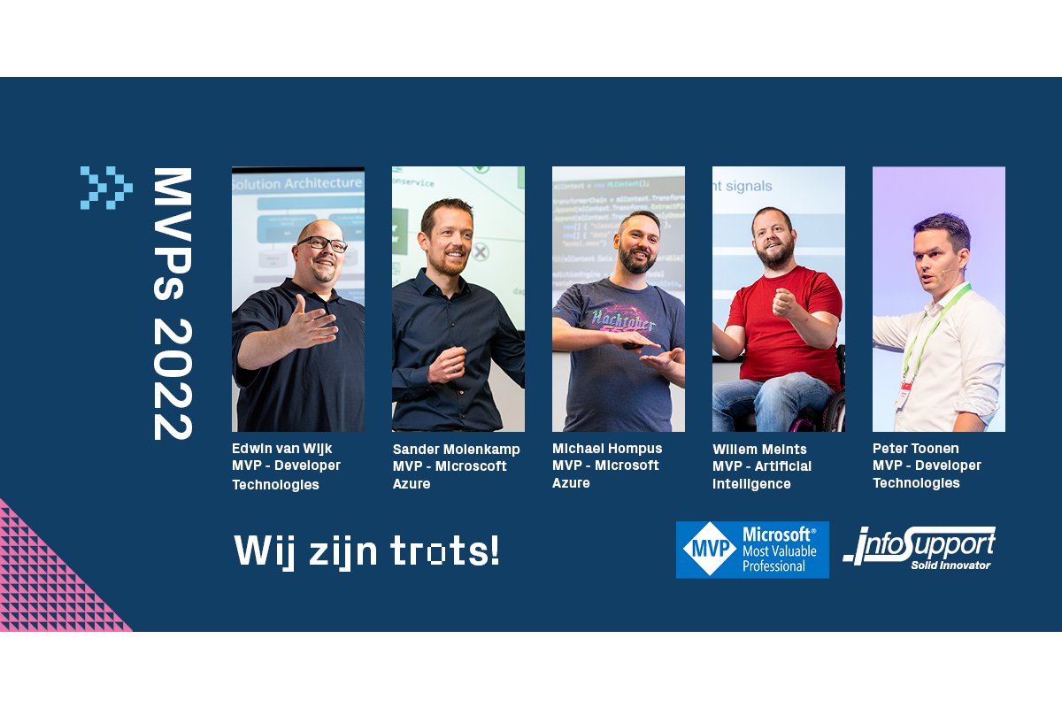 Mijn liefde voor Microsoft Azure heeft uiteindelijk geleid tot mijn benoeming tot Microsoft MVP (Most Valuable Professional). Daar hebben we aanvankelijk niet actief op gestuurd. Als één van de trekkers van de Microsoft community was ik betrokken bij het organiseren van meet-ups, schrijven van blogs, maken van video’s en spreken op conferenties. Puur uit liefhebberij. Toen we besloten om een balletje op te gooien bij Microsoft, gingen we ineens van 0 naar 4 MVP’s binnen Info Support. Er is geen standaard pad hoe je het wordt en het moet echt een bijdrage uit persoonlijke motivatie zijn. Blijkbaar deden we toch iets goed in de ogen van Microsoft.”